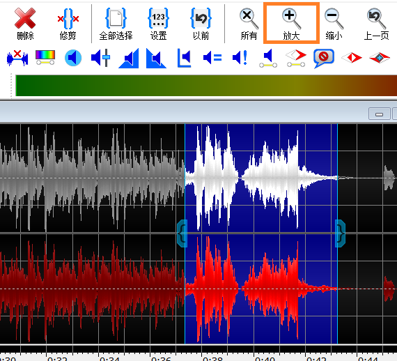 我们先在GoldWave中文版中找到需要保留的部分,大概在哪个位置,然后点击上方的“剪刀”,把这一段截取下来。这里有一个小细节,如果你需要的那段音频非常短,可以点击GoldWave中文版主页面上方的“放大”键,放大波形哦!截取音频之后,点击上方的“剪切”。
