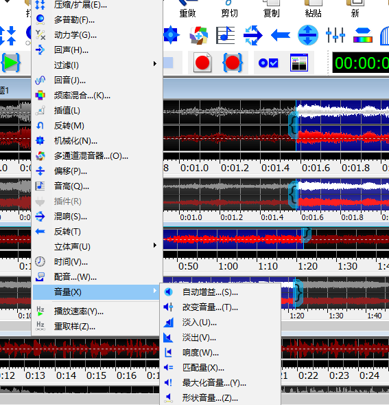 先选中某一部分音频,比如提取出来的人声部分,或者是原本的BGM,然后点击上方的“效果”栏,找到“音量”→“改变音量”即可。